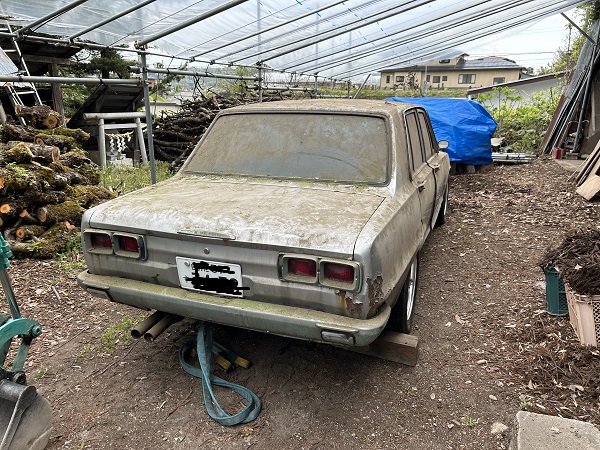 令和6年4月27日土曜日!GW初日におもわぬ依頼が!ハコスカの買取依頼が舞い込んできました!とはいっても昭和46年式の自動車で30年も放置状態、タイヤはペッチャンコ、保管していた納屋には廃材が山のように積まれておりました。当然動く訳もなくタイヤを交換しバックホーでやっとこさ引き出して参りました。